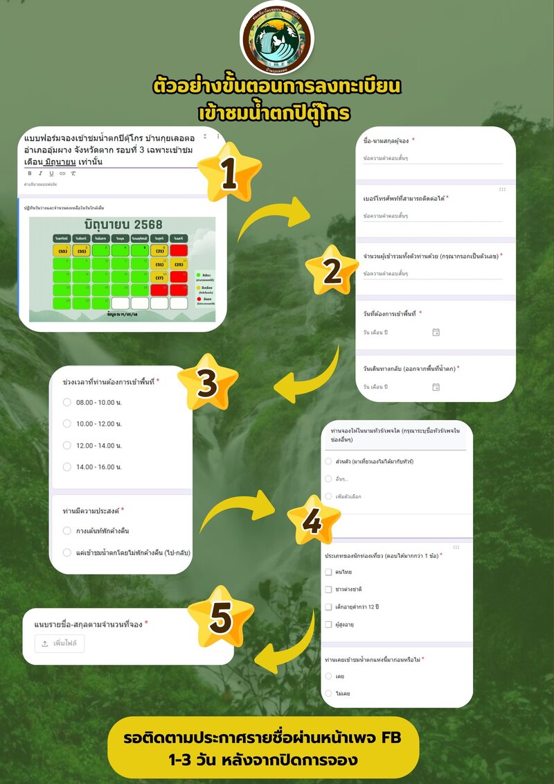 - ข้อมูลที่ต้องระบุ: ผู้เดินทางต้องกรอกข้อมูลจำเป็นให้ครบถ้วน เช่น ชื่อ-นามสกุล, จำนวนผู้ร่วมเดินทาง, วันที่ที่ต้องการมาเที่ยว, เบอร์ติดต่อ, และรายการบริการเสริมที่ต้องการ (เช่น บริการลูกหาบ, ไกด์พิเศษ, อาหารเสริม)