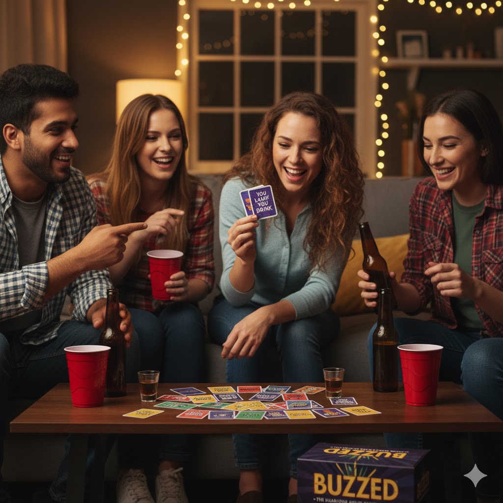 Buzzed เป็นการ์ดเกมที่มีคำถามและคำสั่งให้หยิบแล้วทำตาม