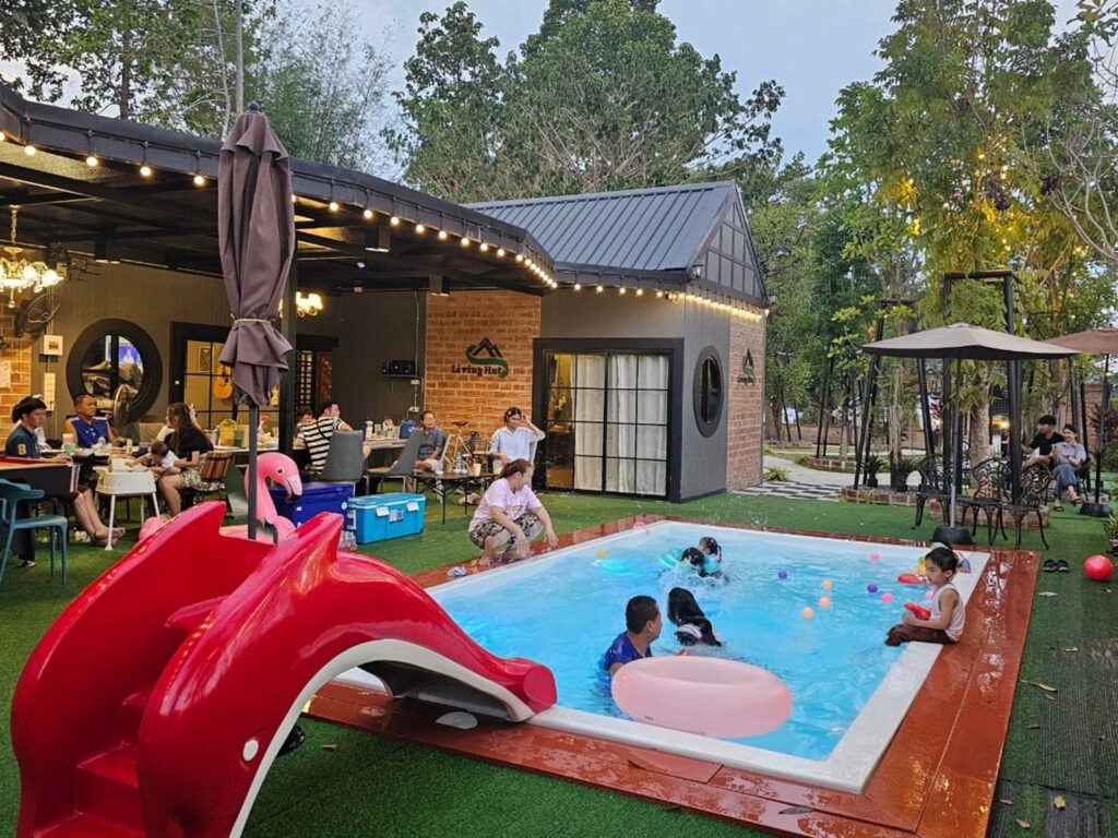 นอกจากนี้ยังสามารถจัดบาร์บีคิว ร่วมเล่นเกมริมสระ หรือถ่ายรูปเช็คอินได้เต็มที่ในพื้นที่สวน–แพกลางน้ำ